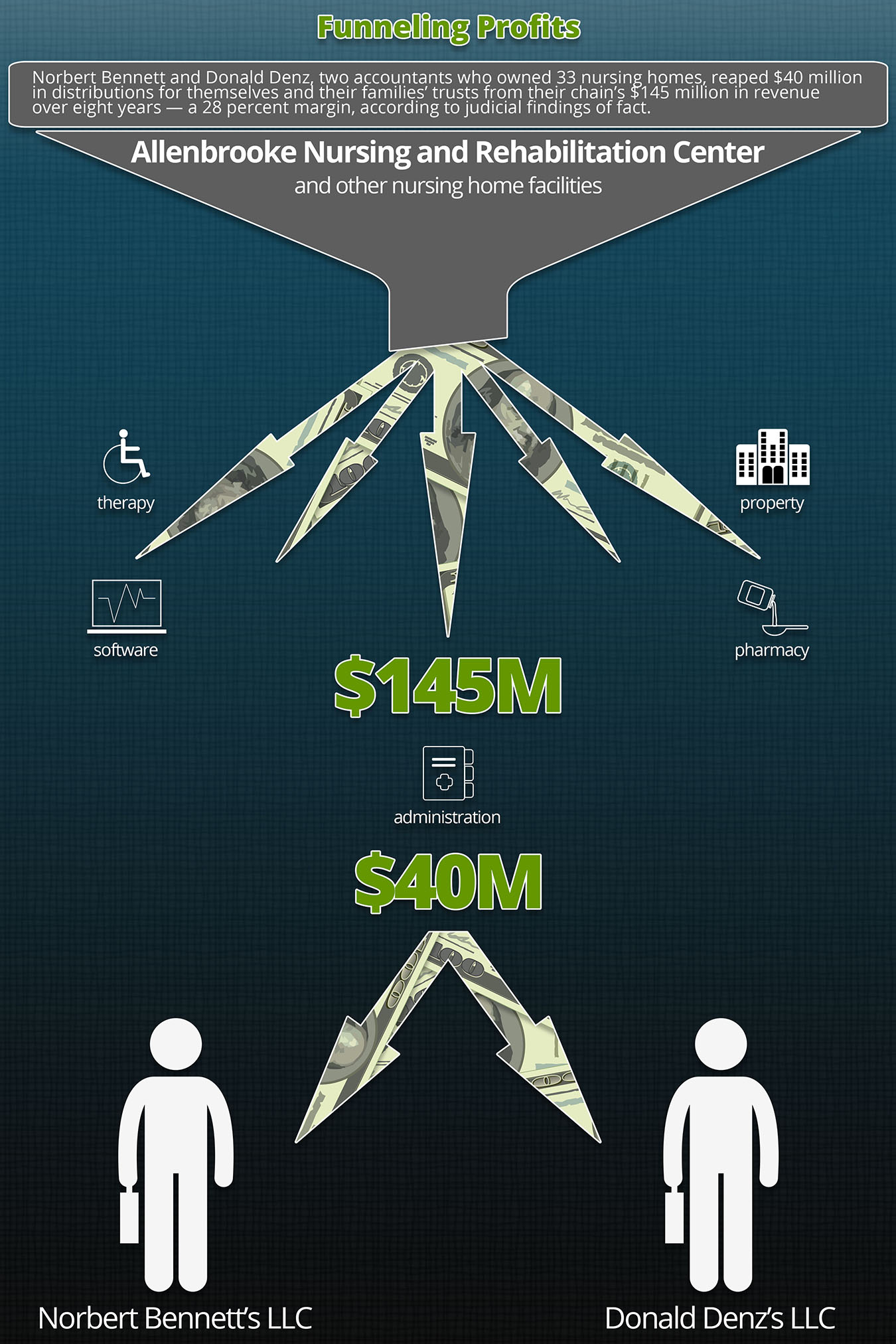 The two Long Island men, Donald Denz and Norbert Bennett, and their families’ trusts collected distributions totaling $40 million from their chain’s $145 million in revenue over eight years — a 28 percent margin, according to the judge’s findings of fact. In 2014 alone, Denz earned $13 million and Bennett made $12 million, principally from their nursing home companies, according to personal income tax filings presented in court.