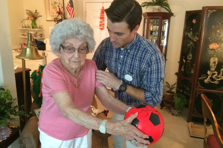 “The big key that we try and focus on here is making sure they’re safe and as independent as they can be,” Harcar said. The side-to-side soccer ball move can help Wilson maintain her balance as she navigates the kitchen or bathroom in her apartment.