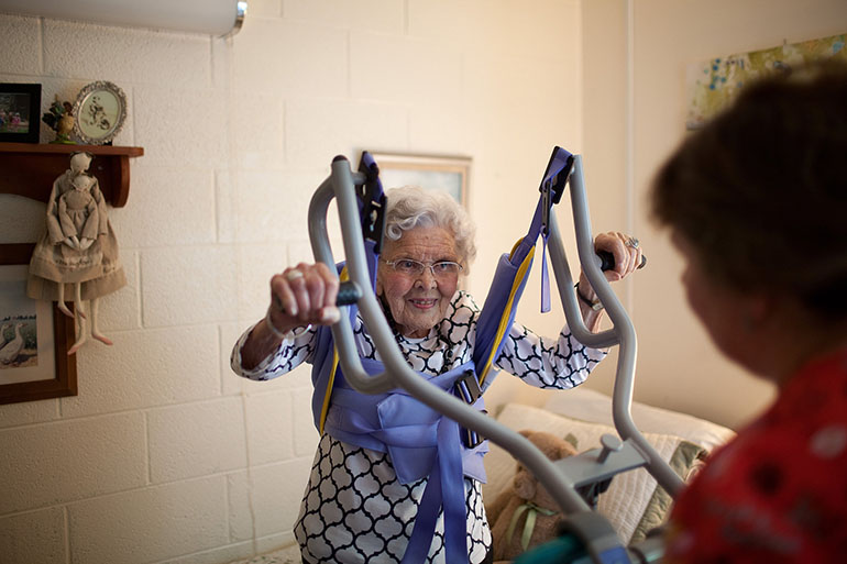 Mary Ann Mohrmann is 85, the average age of Dogwood Village residents. An elementary school teacher for 25 years, she has Charcot-Marie-Tooth disease, a neurological disorder that has weakened her legs, feet and thumbs and compromised her fine motor skills.