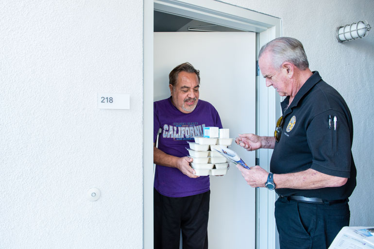 “You’re going to eat well today,” Case told 75-year-old Dave Kelly as she handed him the meals. Kelly lost his sight about two years ago and reluctantly gave up cooking.