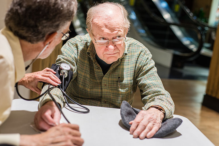 On the mornings that they gather, the seniors start with a blood pressure check by a retired doctor.