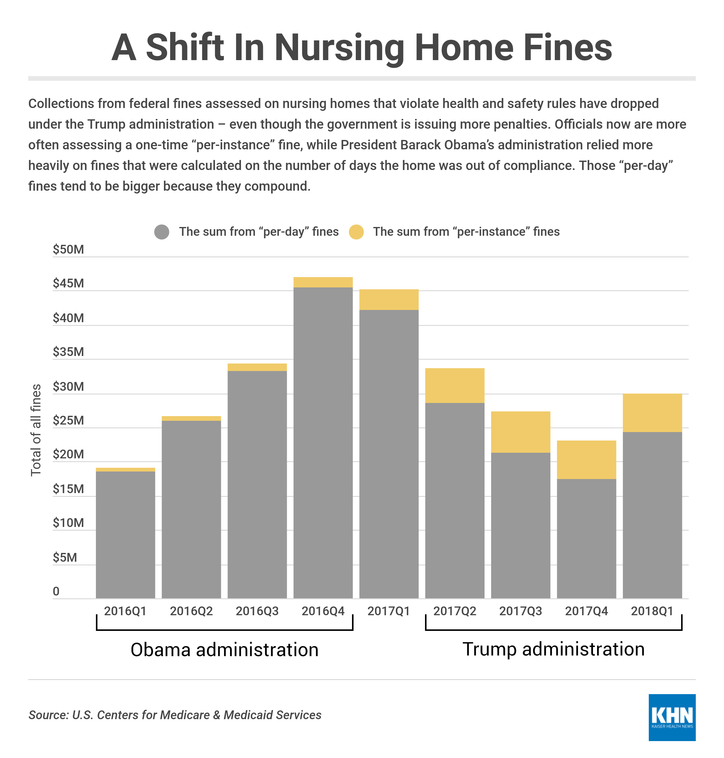 However, KHN found that financial penalties for immediate jeopardies were issued in fewer cases under Trump. And when they were issued, the fines averaged 18 percent less than they did in 2016.