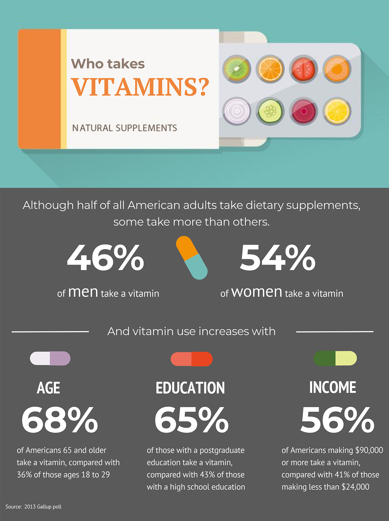 More than half of Americans take vitamin supplements, including 68 percent of those age 65 and older, according to a 2013 Gallup poll. Among older adults, 29 percent take four or more supplements of any kind, according to a Journal of Nutrition study published in 2017.