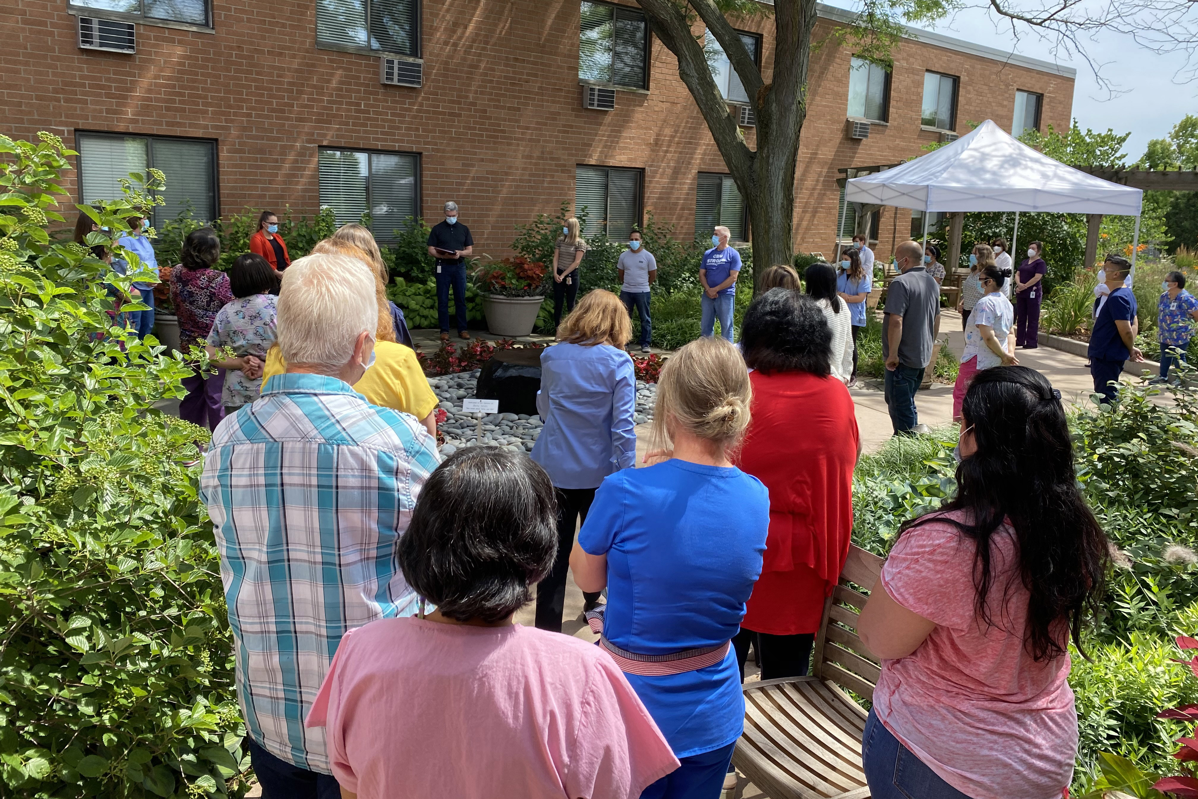 Central Baptist Village, a Norridge, Illinois, nursing home, held a socially distanced garden ceremony to honor a beloved nurse who had died of COVID-19. “Our social service director made a wonderful collage of photos and left Post-its so everyone could write a memory” before delivering it to the nurse’s wife, said Dawn Mondschein, the nursing home’s chief executive officer.