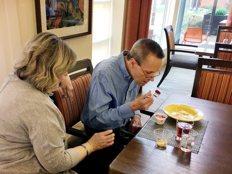 Simpkins, 54, sits down for lunch with Joe, who is a former state employee and a youthful-looking 66 years old. She drapes an arm around his slumping shoulders and assists him as he spears a cold strawberry with his fork.
