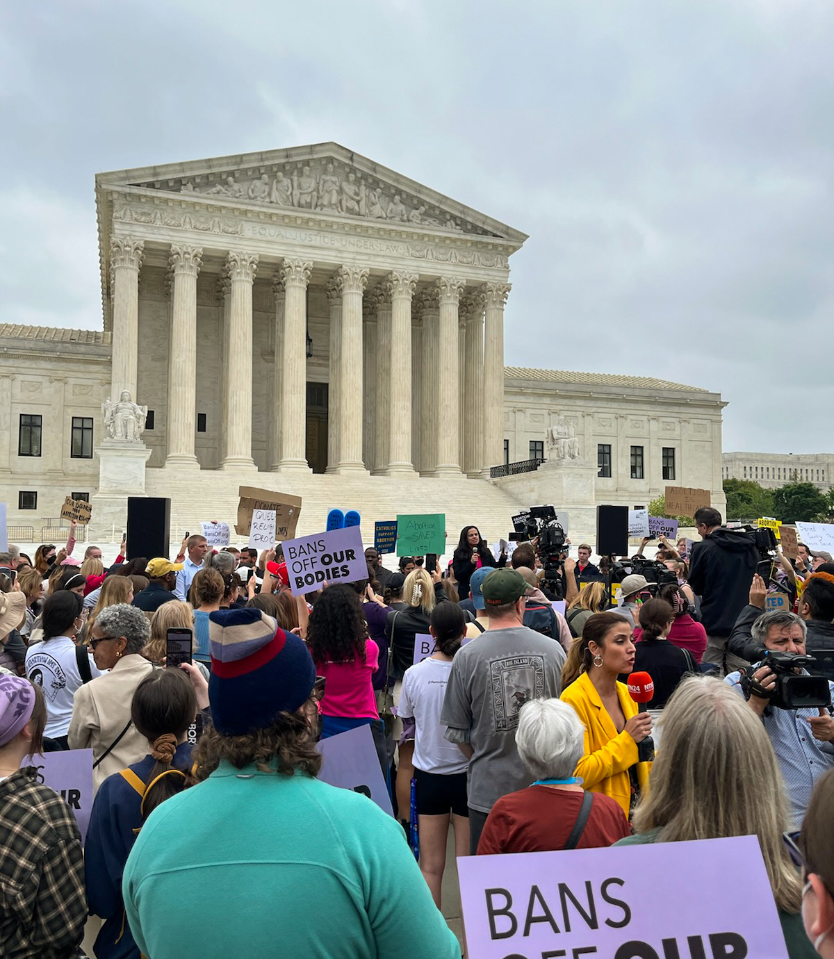 By evening, the number of abortion rights supporters had swelled, filling the entire Supreme Court plaza, as well as the street running in front of it, and overflowing onto parts of the Capitol lawn.