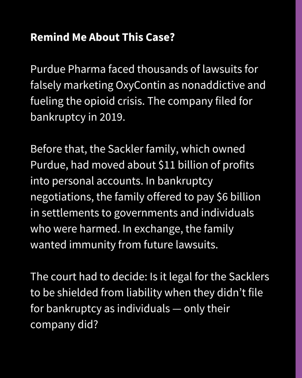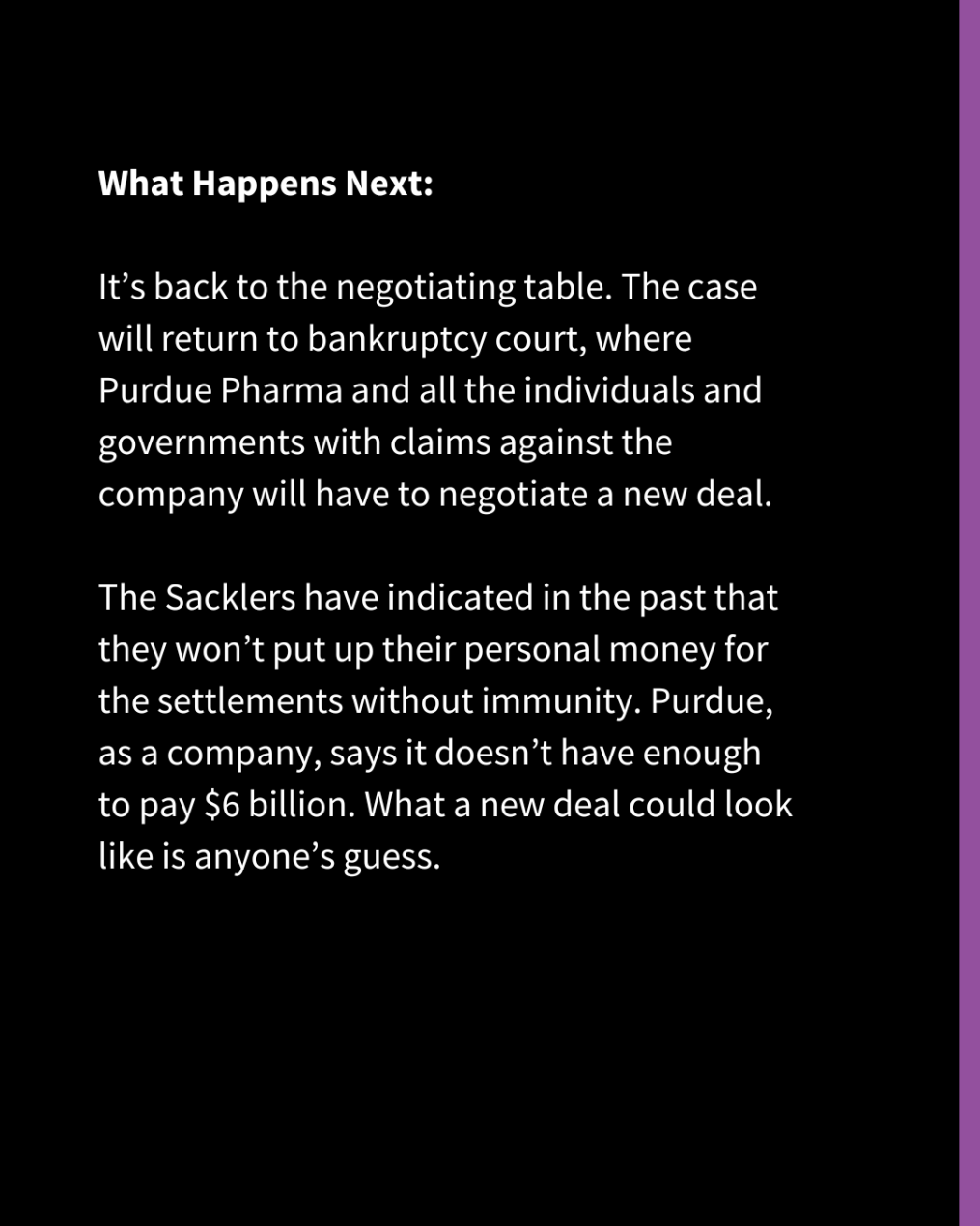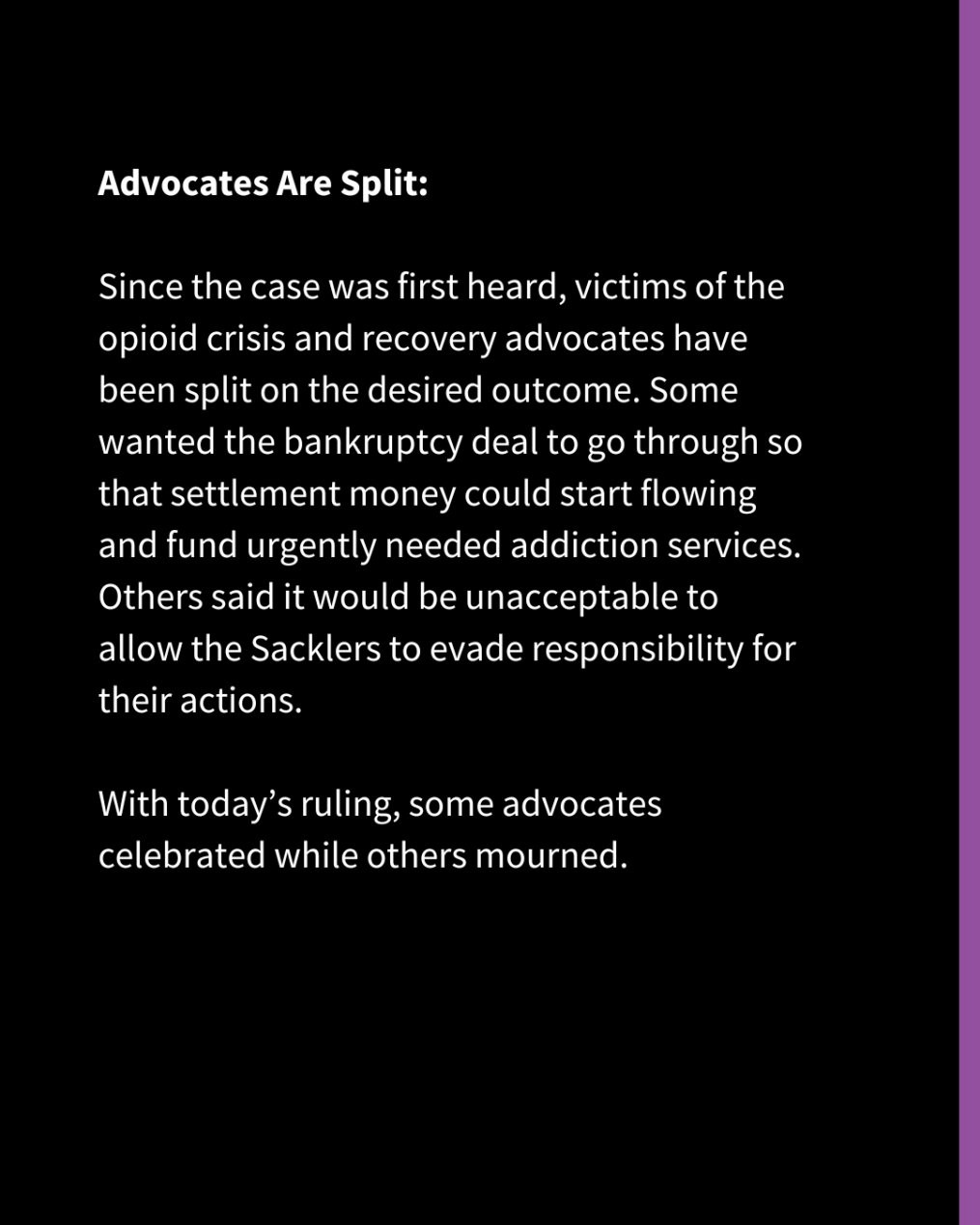 Since the case was first heard, victims of the opioid crisis and recovery advocates have been split on the desired outcome. Some wanted the bankruptcy deal to go through so that settlement money could start flowing and fund urgently needed addiction services. Others said it would be unacceptable to allow the Sacklers to evade responsibility for their actions.