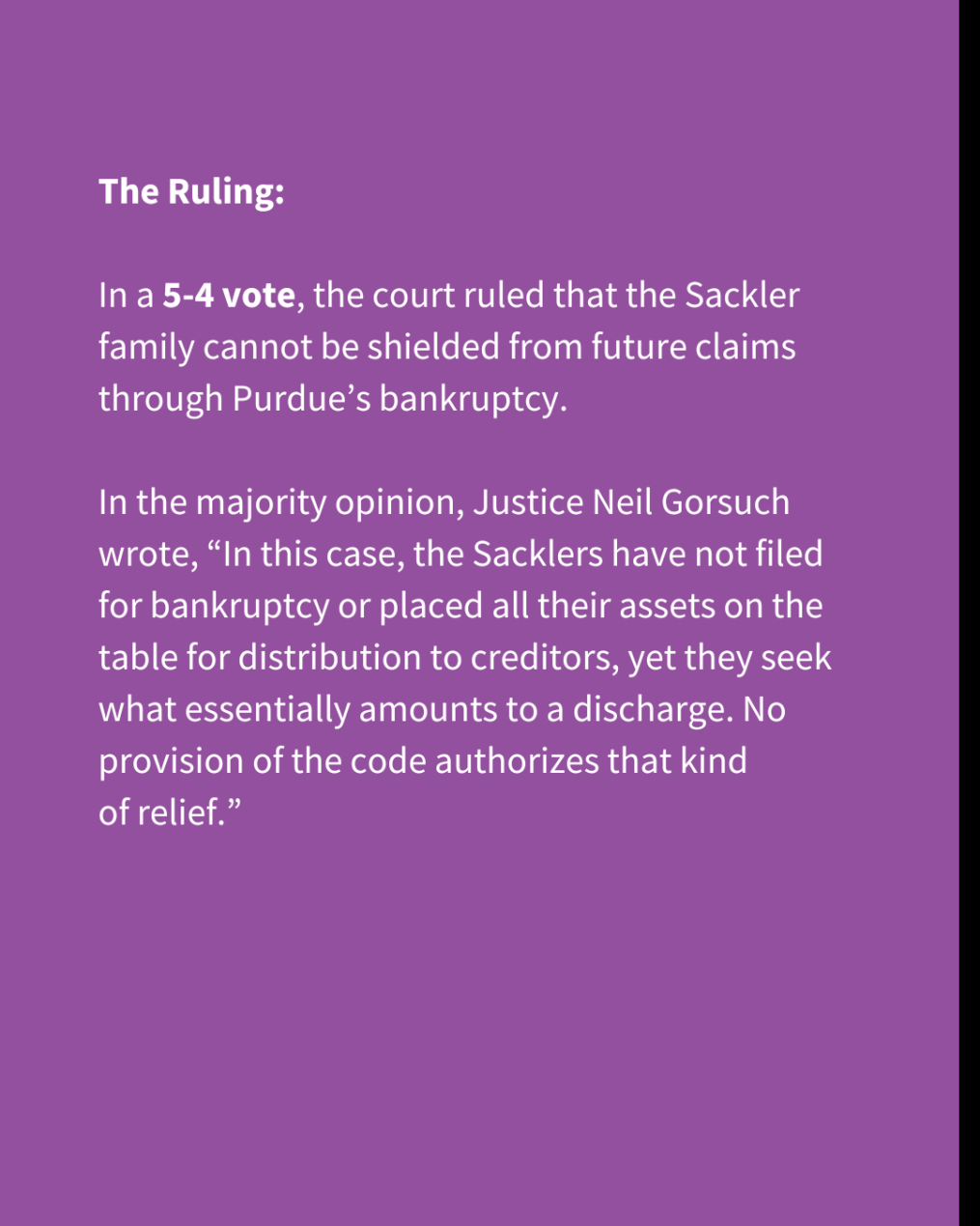 In a 5-4 vote, the court ruled that the Sackler family cannot be shielded from future claims through Purdue’s bankruptcy.