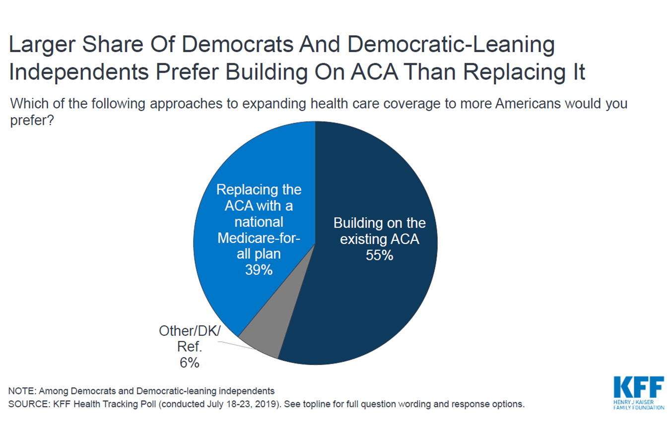 Most Democrats and Democratic-leaning independents would prefer to expand the Affordable Care Act rather than replace it with a “Medicare for All” plan, according to a new tracking poll from the Kaiser Family Foundation.