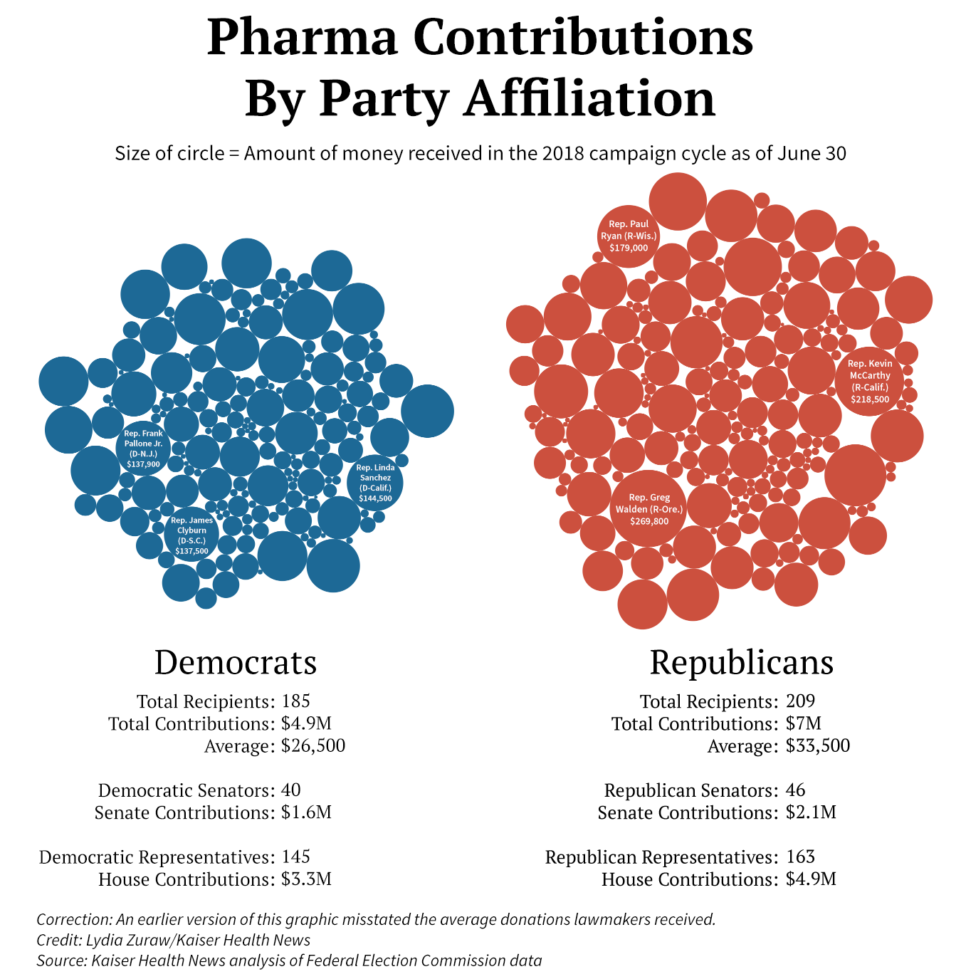 Since the beginning of last year, 34 lawmakers have each received more than $100,000 from pharmaceutical companies. Two of those — Reps. Greg Walden of Oregon, a key Republican committee chairman, and Kevin McCarthy of California, the House Republican majority leader — each received more than $200,000, a new Kaiser Health News database shows.