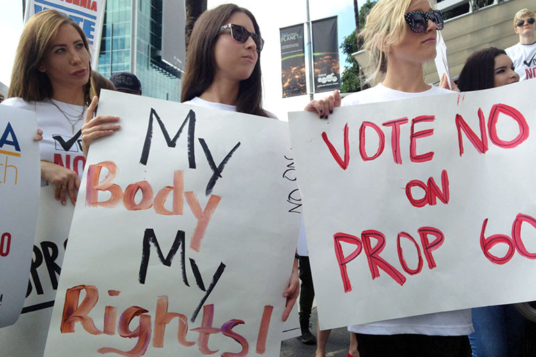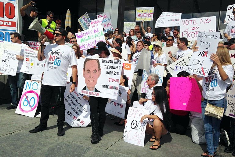 In mid-October, more than a hundred adult film performers rallied outside Weinstein’s office in Los Angeles to protest Proposition 60. They chanted slogans like “Our Bodies, Our Choice!” and carried signs that read “Where is Weinstein?”