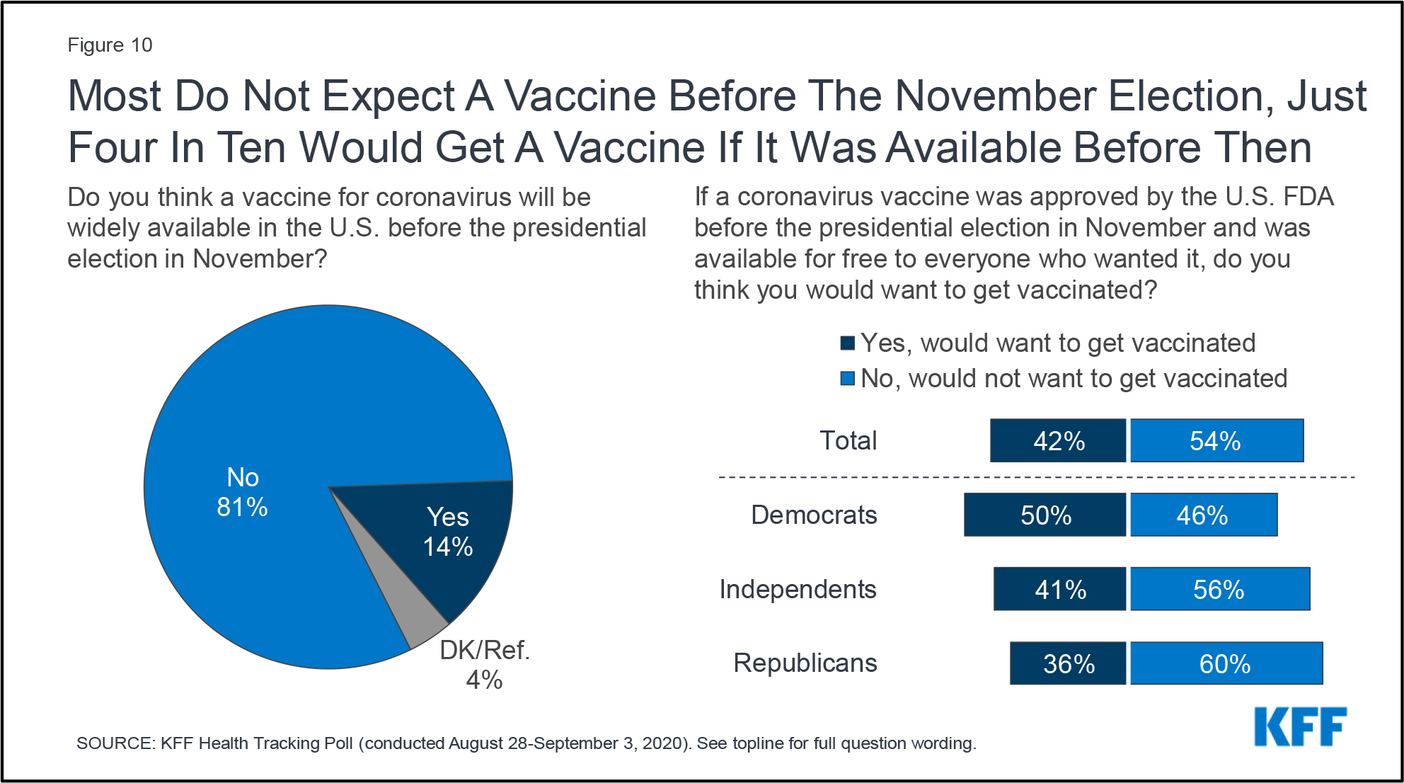 Resistance to taking the vaccine is strong among respondents of all stripes, with 60% of Republicans saying they would not want to be inoculated if a vaccine were available before the Nov. 3 election. Among Democrats, 46% would decline the vaccine.