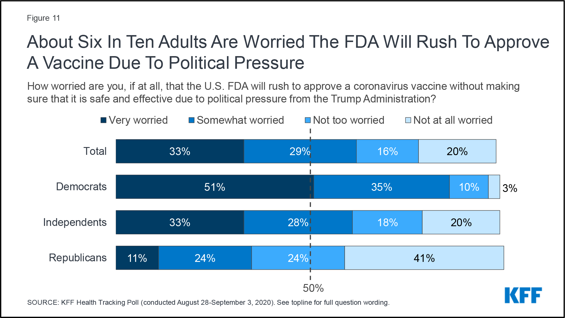 Six of 10 adults said they were worried the Food and Drug Administration will rush to allow a vaccine because of political pressure. The concern is held by 85% of Democrats, 35% of Republicans and 61% of independent voters.