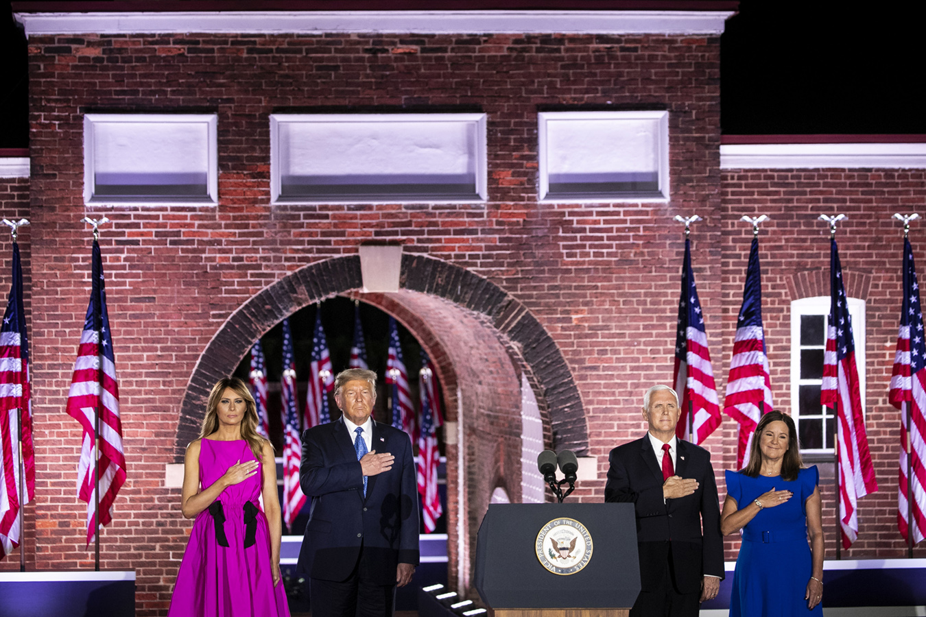 As the number of Americans who have lost their lives to COVID-19 neared 180,000, he spent part of his speech recasting the Trump administration’s handling of the coronavirus response, offering sympathy to “the families who have lost loved ones and have family members still struggling with serious illness” and saluting the “doctors, nurses, first responders, factory workers, truckers and everyday Americans, who put the health and safety of their neighbors first.” He optimistically reported that the U.S. is “on track to have the world’s first safe, effective coronavirus vaccine by the end of this year.” His live audience was mostly unmasked.