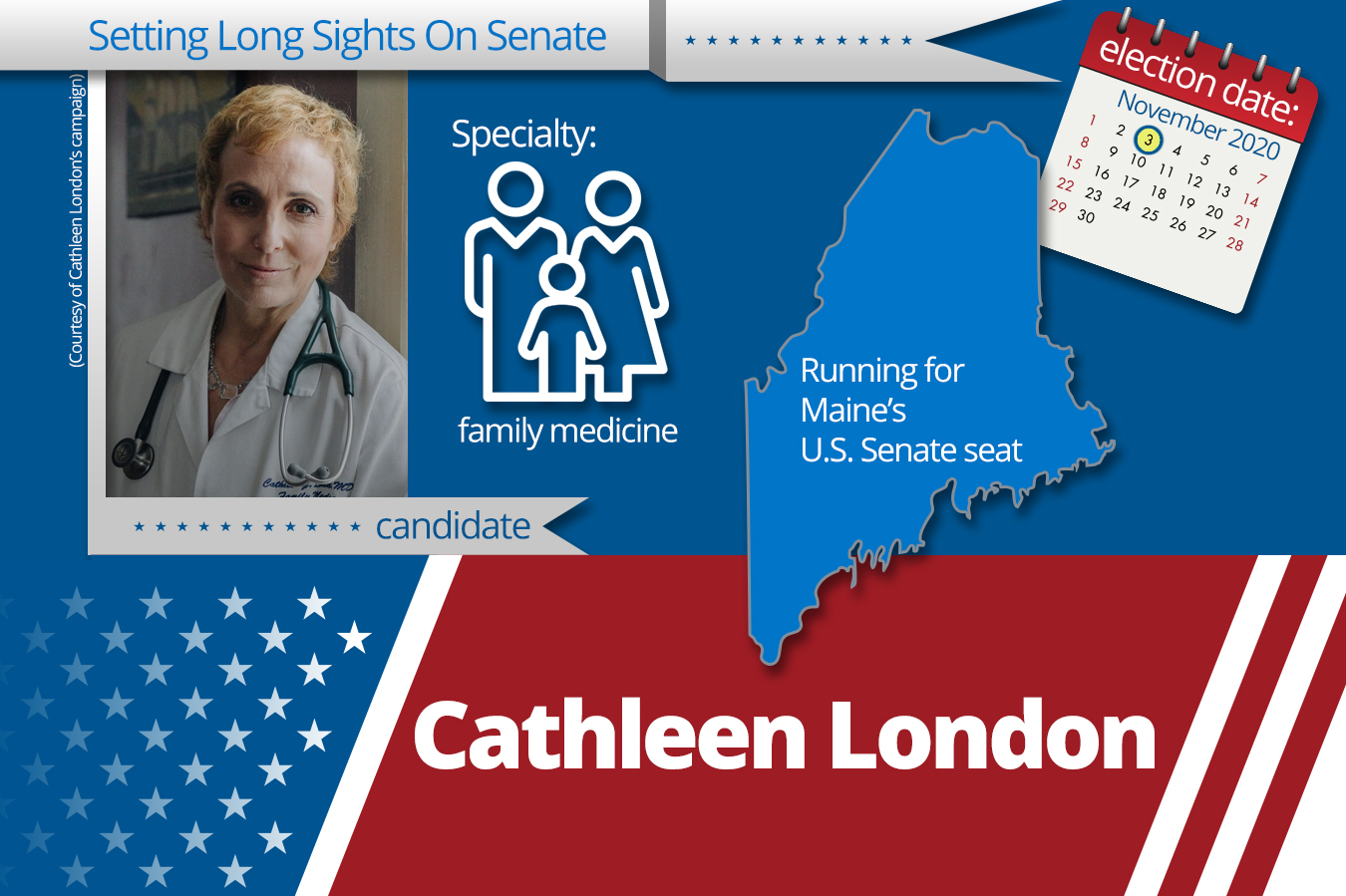 Dr. Cathleen London, a Maine doctor, launched her campaign against four-term incumbent GOP Sen. Susan Collins for the 2020 election. She said she had been considering a run, but the upcoming vote for a justice to replace Anthony Kennedy on the Supreme Court — which could have sweeping implications for reproductive health law — pushed her to declare.