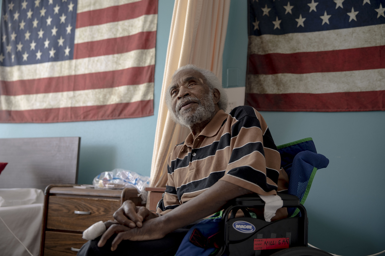 El veterano del ejército Eugene Milligan tiene 75 años y está ciego. Usa una silla de ruedas desde que perdió parte de su pierna derecha a causa de la diabetes, y recibe diálisis porque tiene falla renal.