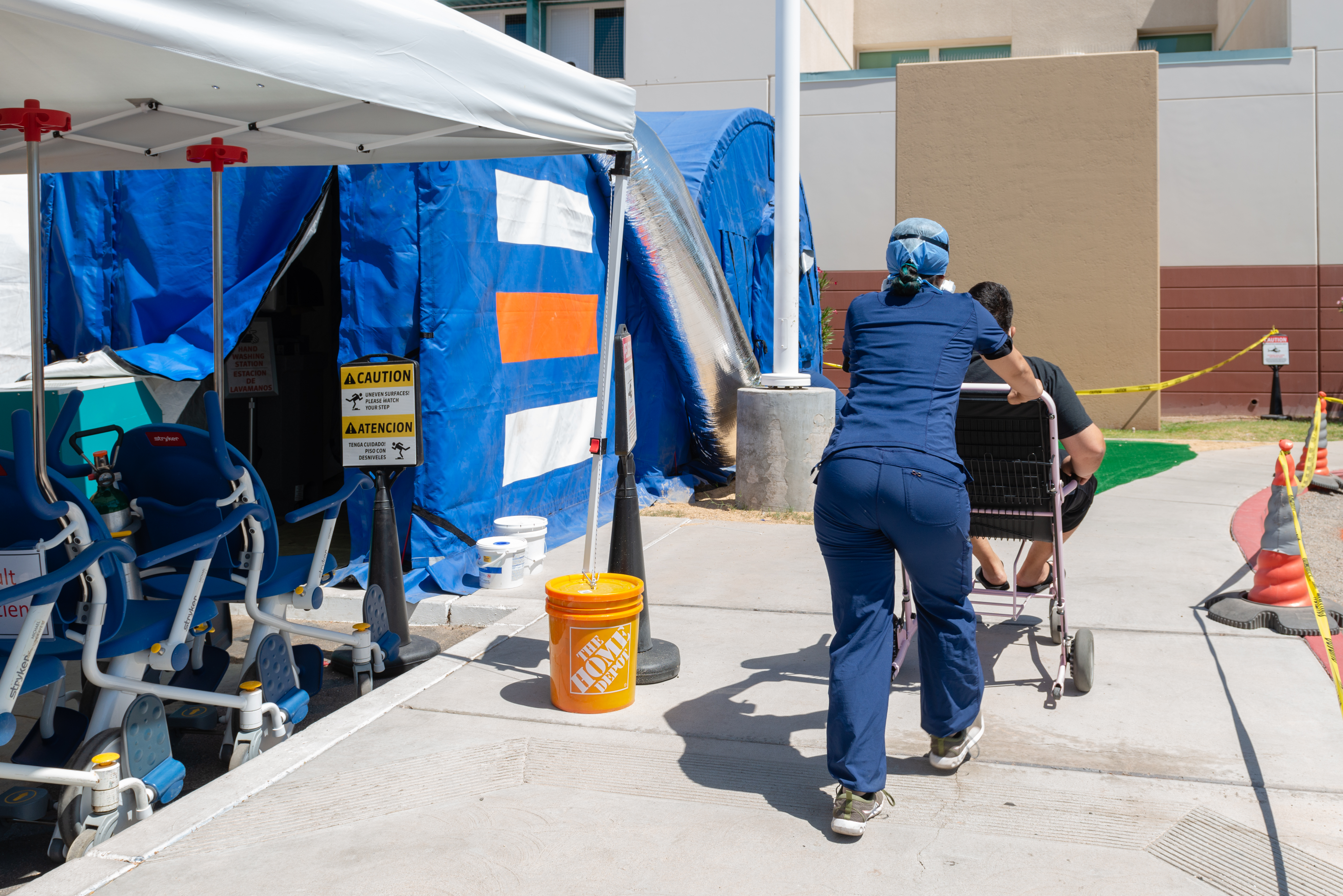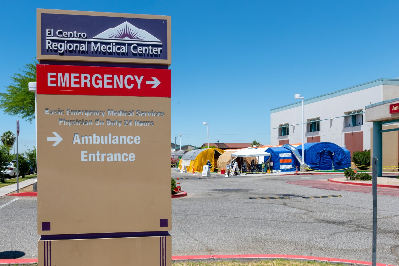 Unas dos horas al este, El Centro Regional Medical Center estaba tan abrumado de pacientes con COVID-19 que tuvo que transferir a algunos a centros de atención médica en San Diego, National City y otros lugares.