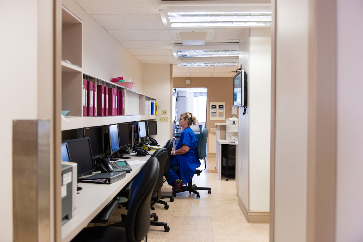 Nagel, que ha trabajado como enfermera en St. Joseph por 18 años, parece conocer a todo el mundo que pasa por los pasillos. Pasa el día saltando entre la sala de emergencias, la sala de maternidad y el área médico-quirúrgica. Ella se presenta en donde se la necesita, llevándole una almohada extra a un paciente, o colocando una vía intravenosa.