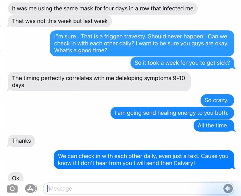 A la mañana siguiente, un jueves, ambos presentaron síntomas y se pusieron en cuarentena. “Yo mismo me infecté al usar la misma máscara durante cuatro días seguidos”, le escribió a Lyons. Durante el fin de semana, sus síntomas parecían leves. Gabrin tosía y sentía dolores en las articulaciones pero no tenía problemas respiratorios significativos. El lunes, sin embargo, tuvo más dolor y pasó el día en cama.