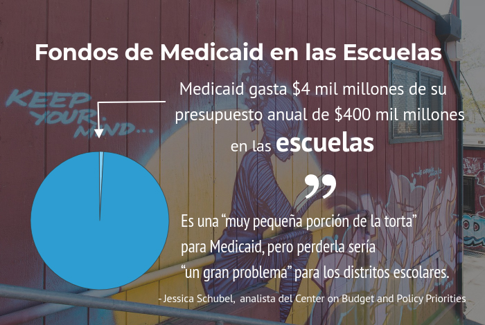 Medicaid gasta solo $4 mil millones de su presupuesto anual de $400 mil millones en las escuelas, una “porción muy pequeña del pastel”, dijo Jessica Schubel, analista de políticas en el Center on Budget and Policy Priorities, una entidad bipartidista. Pero para los distritos escolares que ofrecen una variedad de servicios, los que silenciosamente se han vuelto vitales para estudiantes y familias, perder esta fuente de financiamiento sería “un gran problema”.