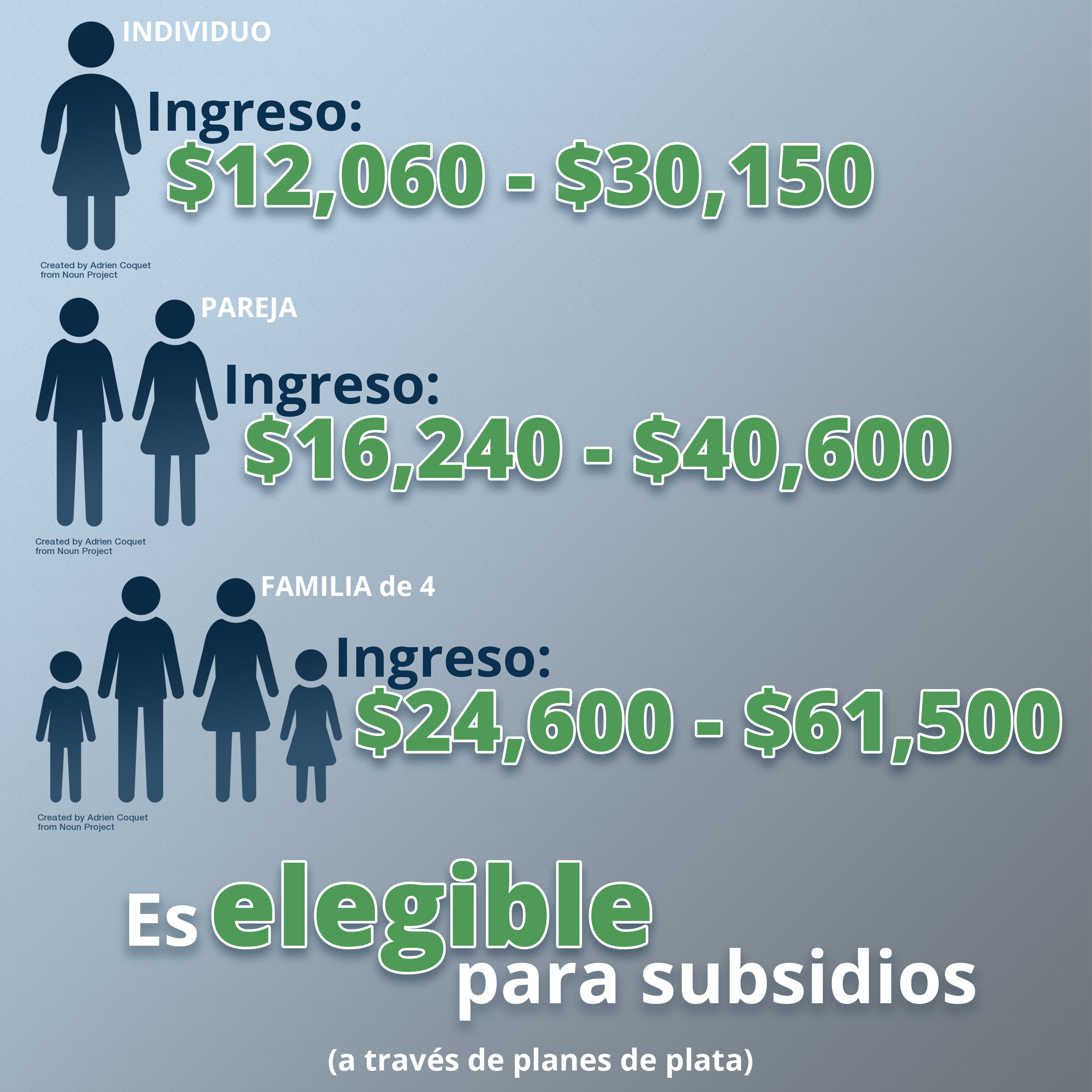 El ingreso del hogar está entre $12,060 y $30,150 para un individuo, $16,240 y $40,600 para una pareja, y $24,600 y $61,500 para una familia de cuatro.