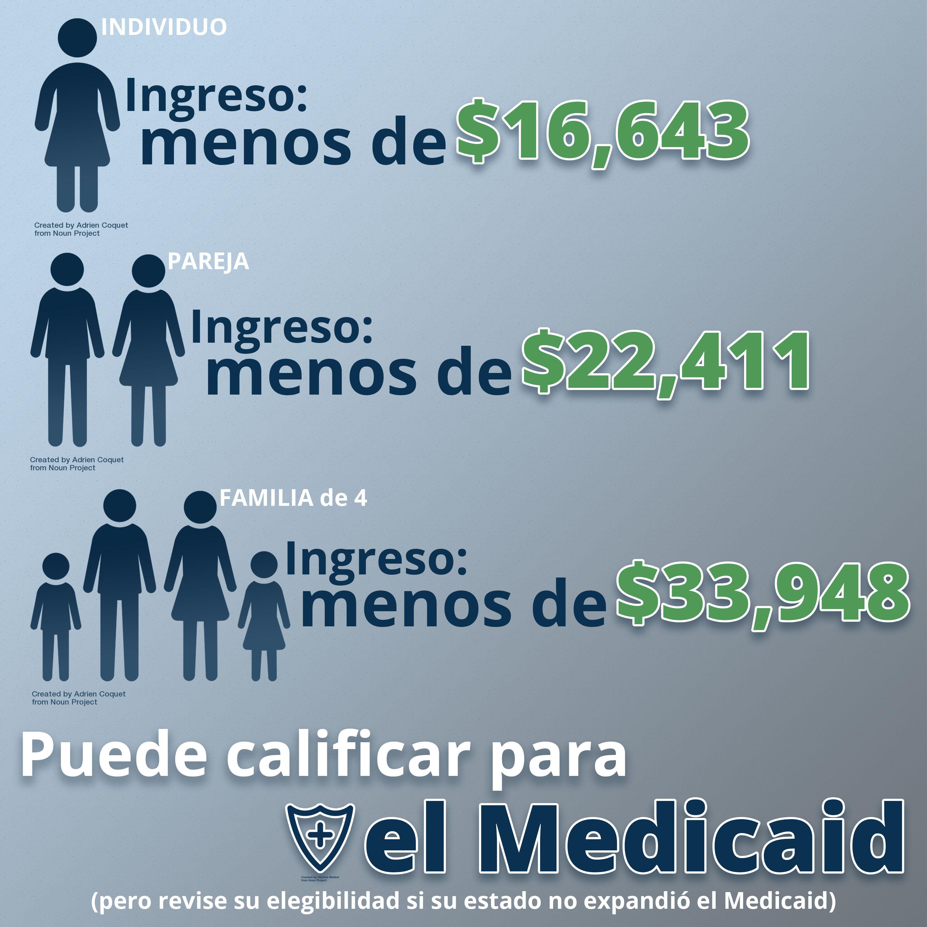 El ingreso del hogar es menos de $16,643 para un individuo, $22,411 para una pareja y $33,948 para una familia de cuatro.