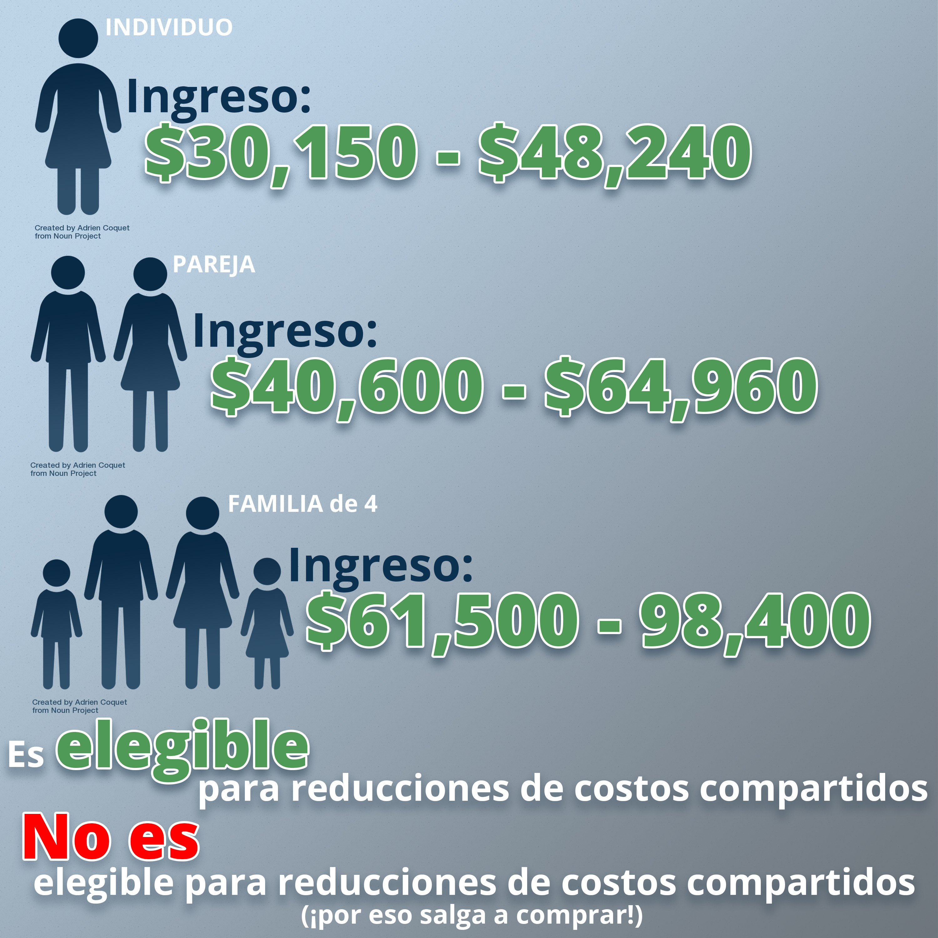 El ingreso del hogar está entre $30,150 y $48,240 para un individuo, $40,600 y $64,960 para una pareja y $61,500 y $98,400 para una familia de cuatro.