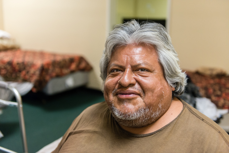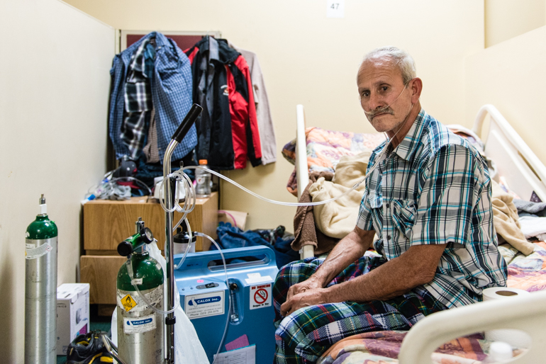 Elvin Quiñones, uno de los pacientes en el Coral Motel, camina con pasos pesados alrededor del estacionamiento en flip-flops (ojotas) para mostrar su hogar anterior – un pequeño Datsun B210 sedan blanco.