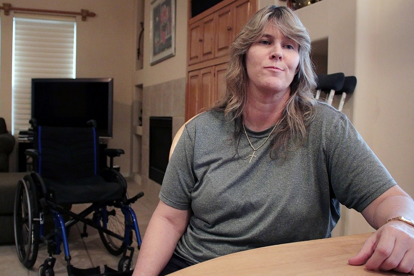 Hubbard acomoda su pierna, con cuidado de no rozarla contra la mesa de la cocina en su casa al este de Phoenix, Arizona. Está roja e hinchada, todavía con las cicatrices de una úlcera que la llevó al hospital hace unos meses.