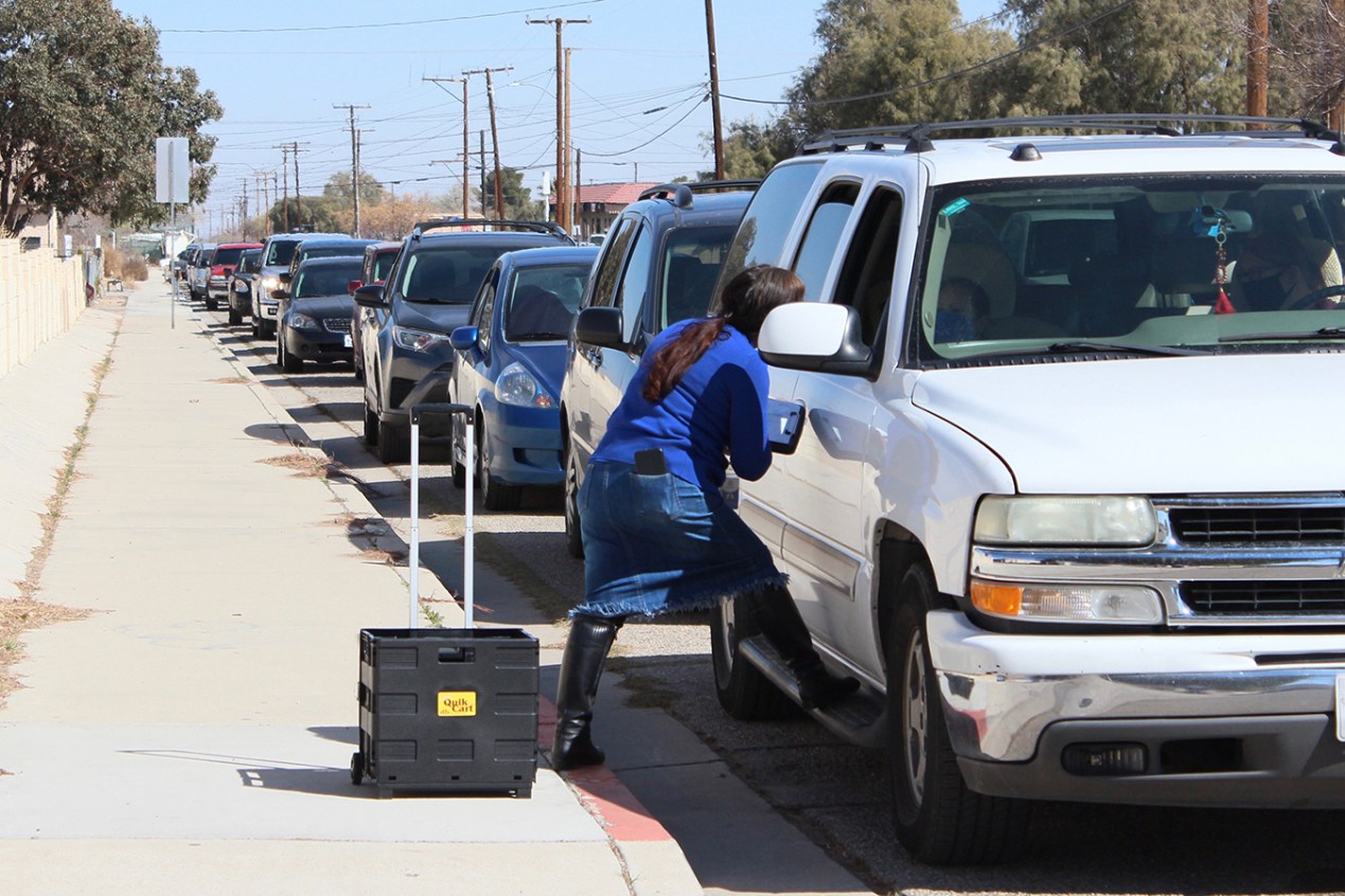 ADELANTO, California. – Leonor García sostuvo su carpeta cerca de su pecho y golpeó la ventana del auto con los nudillos. Había docenas de vehículos alineados en un tramo tranquilo de la carretera en Adelanto, California, una pequeña ciudad cerca del borde suroeste del desierto de Mojave. El conductor estaba esperando que la fila del banco de alimentos comenzara a moverse y bajó la ventanilla del pasajero lo suficiente para escuchar a García.