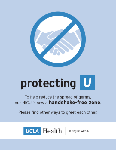 El experimento anti-apretón de manos se realizó en dos salas de cuidado intensivo neonatal de la UCLA, en Westwood y Santa Mónica. Comenzando en 2015, Sklansky y sus colegas explicaron al personal y a las familias el propósito de las zonas libres de apretón de manos y las señales que designaban las nuevas zonas. Los signos presentan dos manos que se agarran entre sí dentro de un círculo con una línea azul a través de él, y las palabras: “Para ayudar a reducir la propagación de gérmenes, ahora nuestra NICU es una zona libre de apretones de manos. Por favor, busquen otras maneras de saludarse”.
