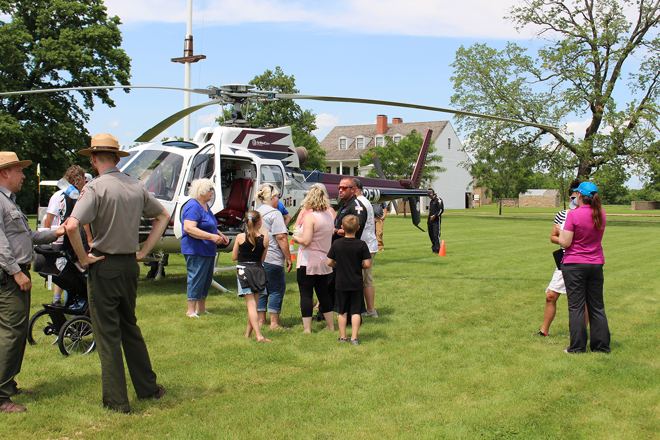 Once the helicopter landed, a tall pilot and two crewmembers stepped out and the onlookers quickly formed a line on the grass. Susan Glossip, who brought her grandchildren to see the helicopter, encouraged them to pose for a picture.