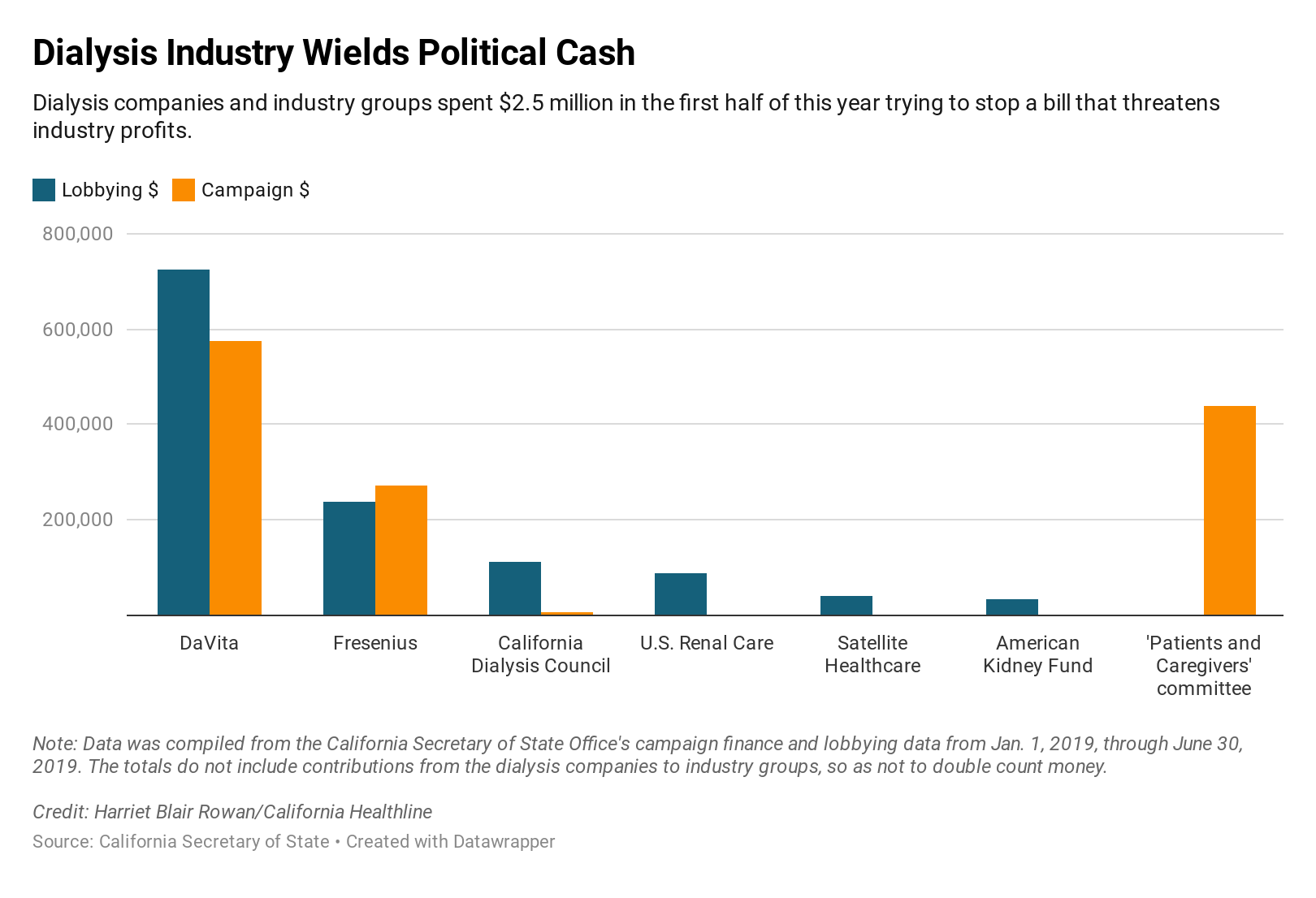 The dialysis industry spent about $2.5 million in California on lobbying and campaign contributions in the first half of this year in its ongoing battle to thwart regulation, according to a California Healthline analysis of campaign finance reports filed with the state.