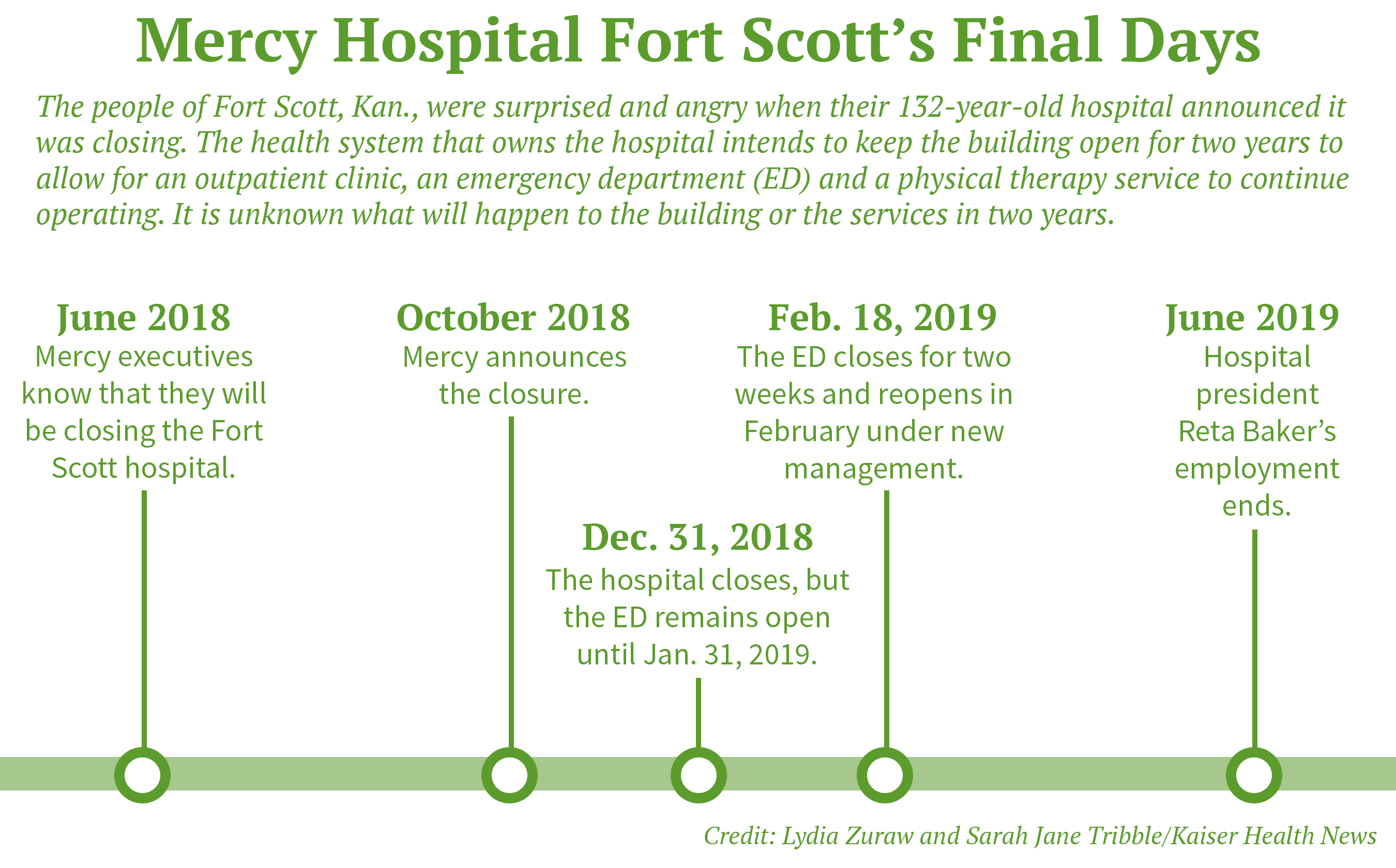 Knowing that emergency care was crucial, the hospital’s owner, St. Louis-based Mercy, agreed to keep Fort Scott’s emergency doors open an extra month past the hospital’s Dec. 31 closure, to give Baker time to find a temporary operator. A last-minute deal was struck with a hospital about 30 miles away, but the ER still needed to be remodeled and the new operator had to meet regulatory requirements. So, it closed for 18 days — a period that proved perilous.