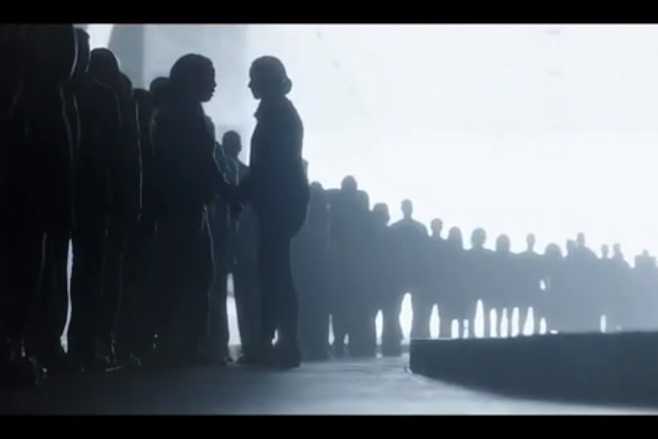 The scene is shadowy, and the background music foreboding. On the TV screen, a stream of beleaguered humans stand in an unending line.