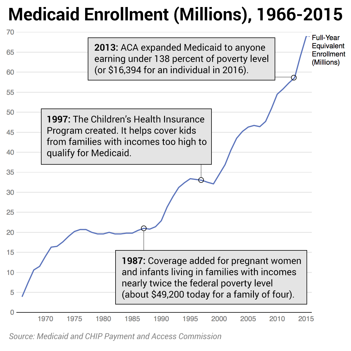 Over the past 40 years and in particular since the 1980s, Medicaid expanded beyond its roots as a welfare program. In 1987, Congress added coverage for pregnant women and children living in families with incomes nearly twice the federal poverty level (about $49,200 today for a family of four).