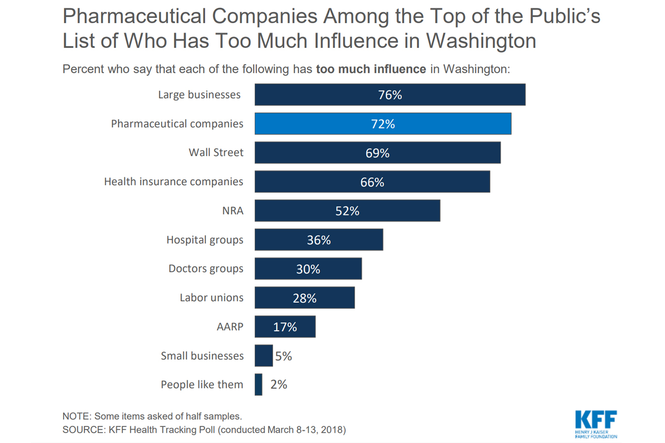 A poll from the Kaiser Family Foundation found that 72 percent of people think the drug industry has too much influence in Washington —outweighing the 69 percent who feel that way about Wall Street or the 52 percent who think the NRA has too much power. Only the large-business community outranked drugmakers. (Kaiser Health News is an editorially independent program of the foundation.)