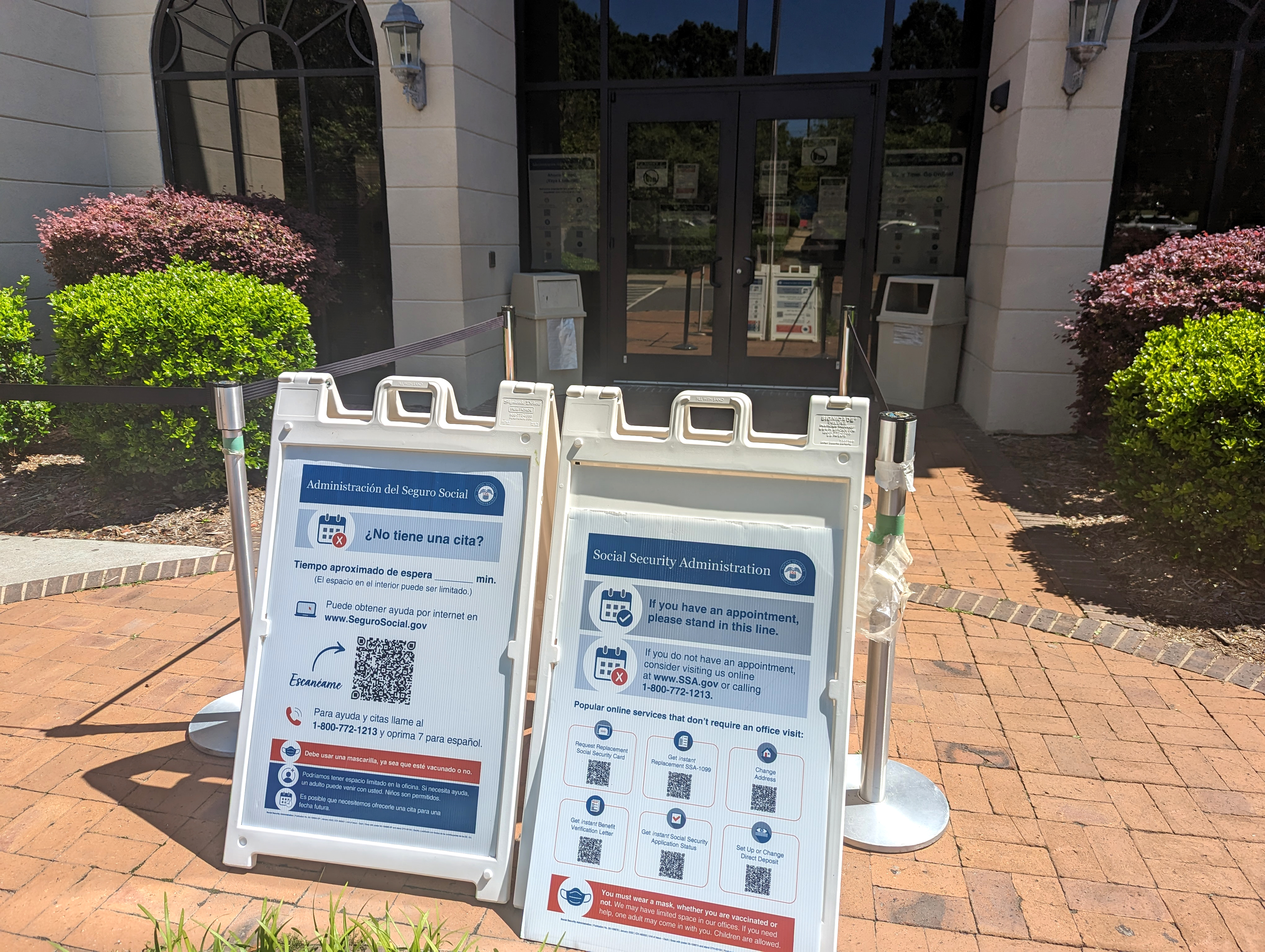 A sign at a Social Security Administration field office in Charlotte, North Carolina, encourages visitors to consider calling the agency for assistance if they don’t have an appointment. Most callers to the agency are unable to reach an agent, federal lawmakers say. (Fred Clasen-Kelly/KFF Health News)