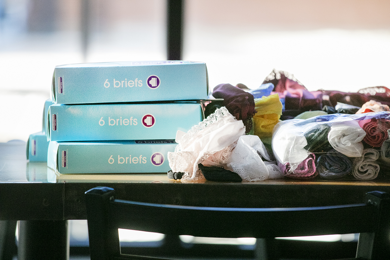 Davis stacked boxes of tampons, pads, liners and wipes in the middle of long wooden tables. An enormous cardboard box was filled with women’s underwear. Each cloth bag would get 40 tampons, 20 pads, 20 liners, six pairs of underwear and wipes.
