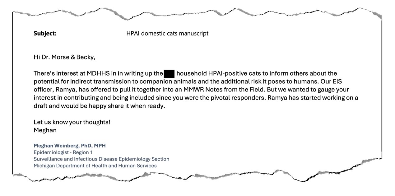 Another bird flu study slated to be published in the MMWR last week concerns the possibility that people working in Michigan’s dairy industry infected their pet cats. These cases were partly revealed last year in emails obtained by KFF Health News. In one email from July 22, an epidemiologist pushed to publish the group’s investigation to “inform others about the potential for indirect transmission to companion animals.”