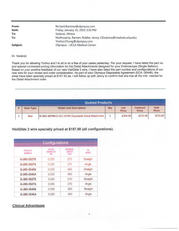 Later, on Jan. 23, 2015, Olympus salesman Richard Ramirez sent an email thanking a UCLA doctor for allowing him and another company representative “to sit in on a few of your cases yesterday.”