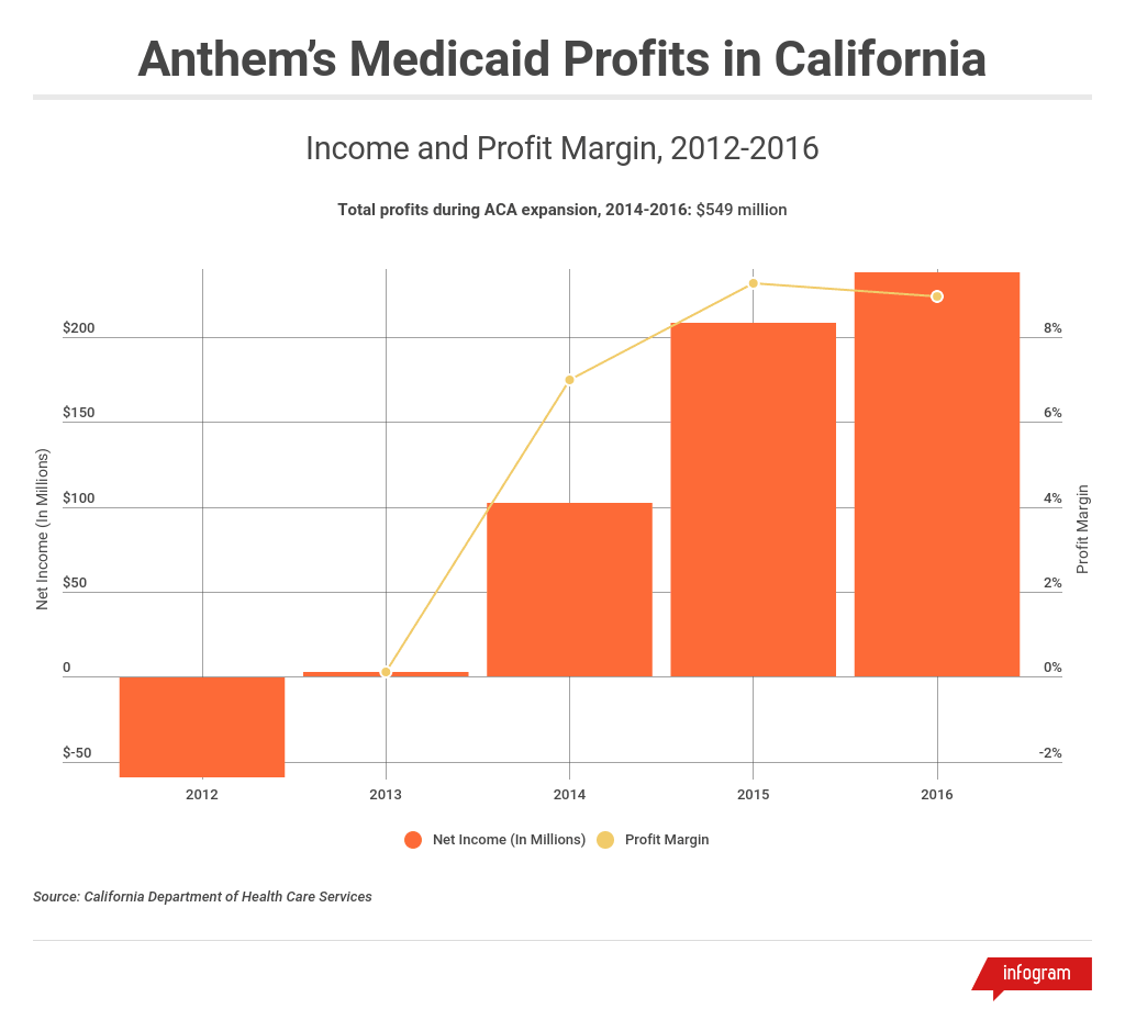 A unit of Centene Corp., the largest Medicaid insurer nationwide, raked in $1.1 billion in profits from 2014 to 2016, according to state data obtained and analyzed by Kaiser Health News. Anthem, another industry giant, turned a profit of $549 million from California’s Medicaid program in the same period.