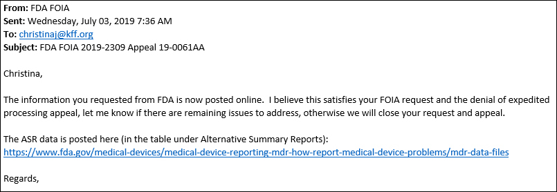 KHN had asked the FDA to expedite processing in April, citing a March 27 tweet by FDA Commissioner Scott Gottlieb, which stated, “It’s imperative that all safety information be available to the public. We’re now prioritizing making ALL of this data available.”