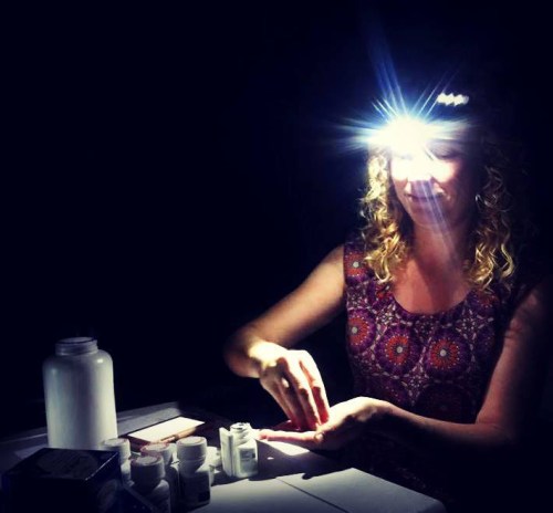 Dr. Asa Oxner, an internal medicine physician in Tampa, Fla., uses a headlamp to count pills while working in an area of Puerto Rico without power. (Courtesy of Dr. Asa Oxner)