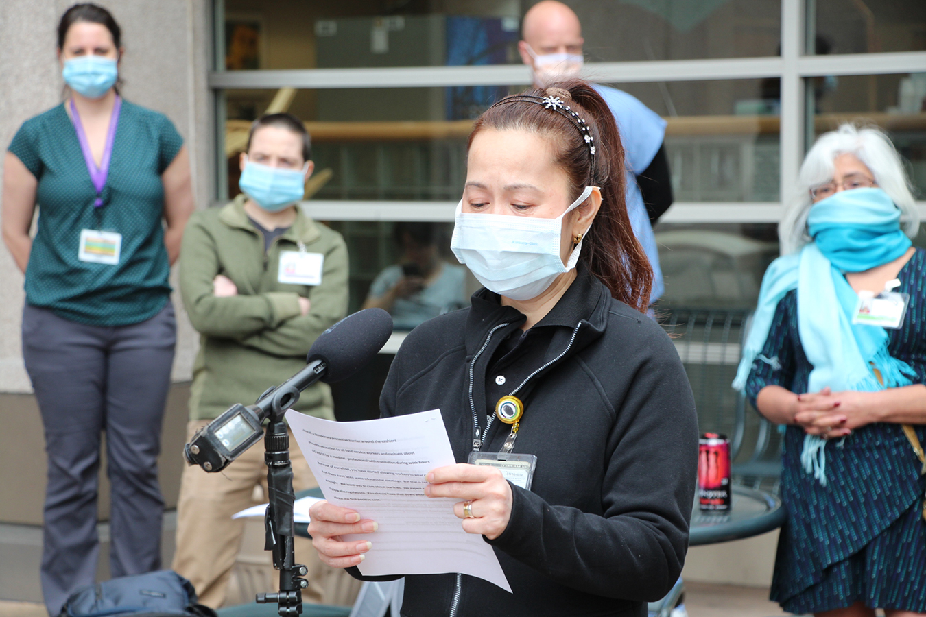 In early April, cafeteria workers delivered a petition to hospital management, with the support of WFSE and Service Employees International Union Local 925, with 450 signatures. They requested the hospital close the Plaza Cafe for a deep cleaning, install a temporary protective barrier around the cashiers and bring in a medical professional to educate all cafeteria staff about COVID-19, with translations in other languages.