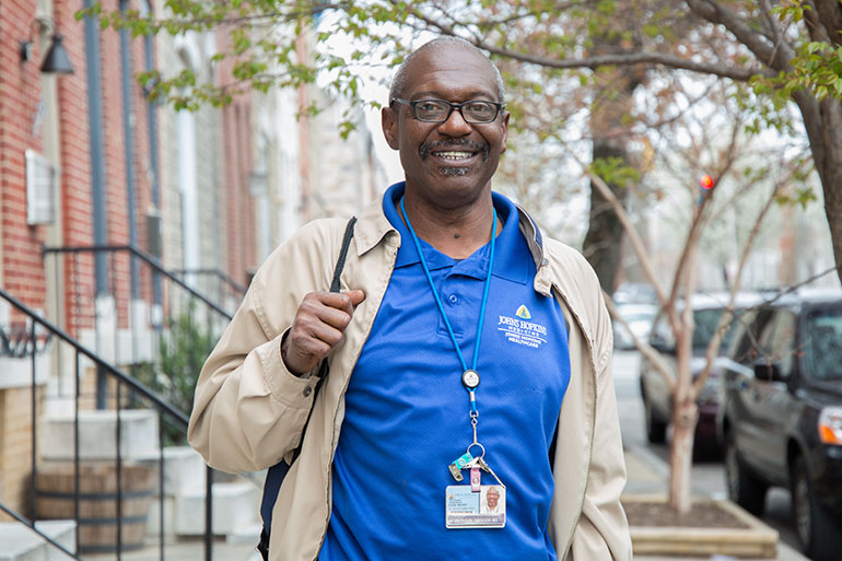 For Missouri, that’s invaluable. When visiting patients, he avoids business clothes that might render him unapproachable, opting for a shirt and lanyard showing he’s from Hopkins, but also jeans and brown walking shoes. He jokes with Berry’s grandmother, and recognizes his dog. After fist-bumping Berry goodbye — they’ll check in later by phone, they confirm — he can cross the street to his next client, a woman with substance abuse problems. He’s a recovering addict himself.