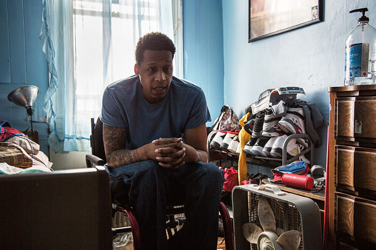 One recent day at the end of March, he visited Vincent Berry, a 28-year-old man who’s paralyzed from the waist down, a condition resulting from a years-ago gunshot wound after a drug deal went sour. Berry’s doing well medically, but he lives with his aging grandmother, in the upstairs bedroom of a narrow apartment where he relies on help from friends and family to be able to leave. Missouri has been trying to help him secure independent, wheelchair-accessible housing that will make it possible for him go to school or pursue other activities that might move his life forward.