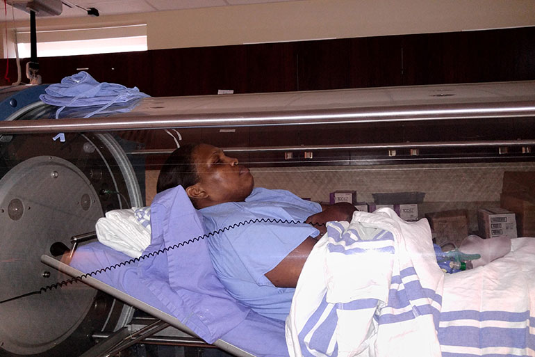 Stretched out in one of the hospital’s four hyperbaric chambers, wrapped in blankets with her head propped up to watch television, Hall breathed pure oxygen for two hours at a time.