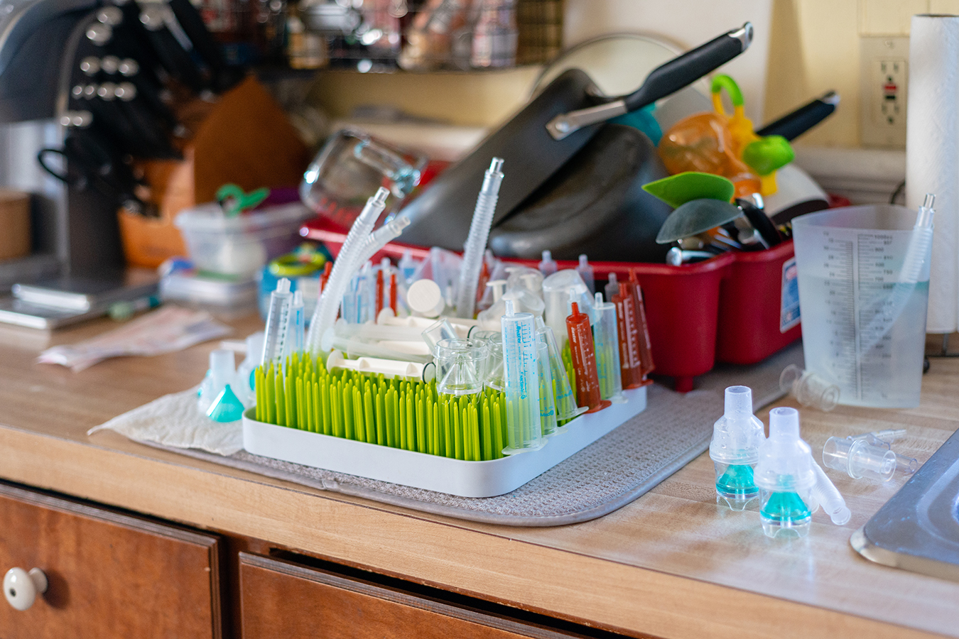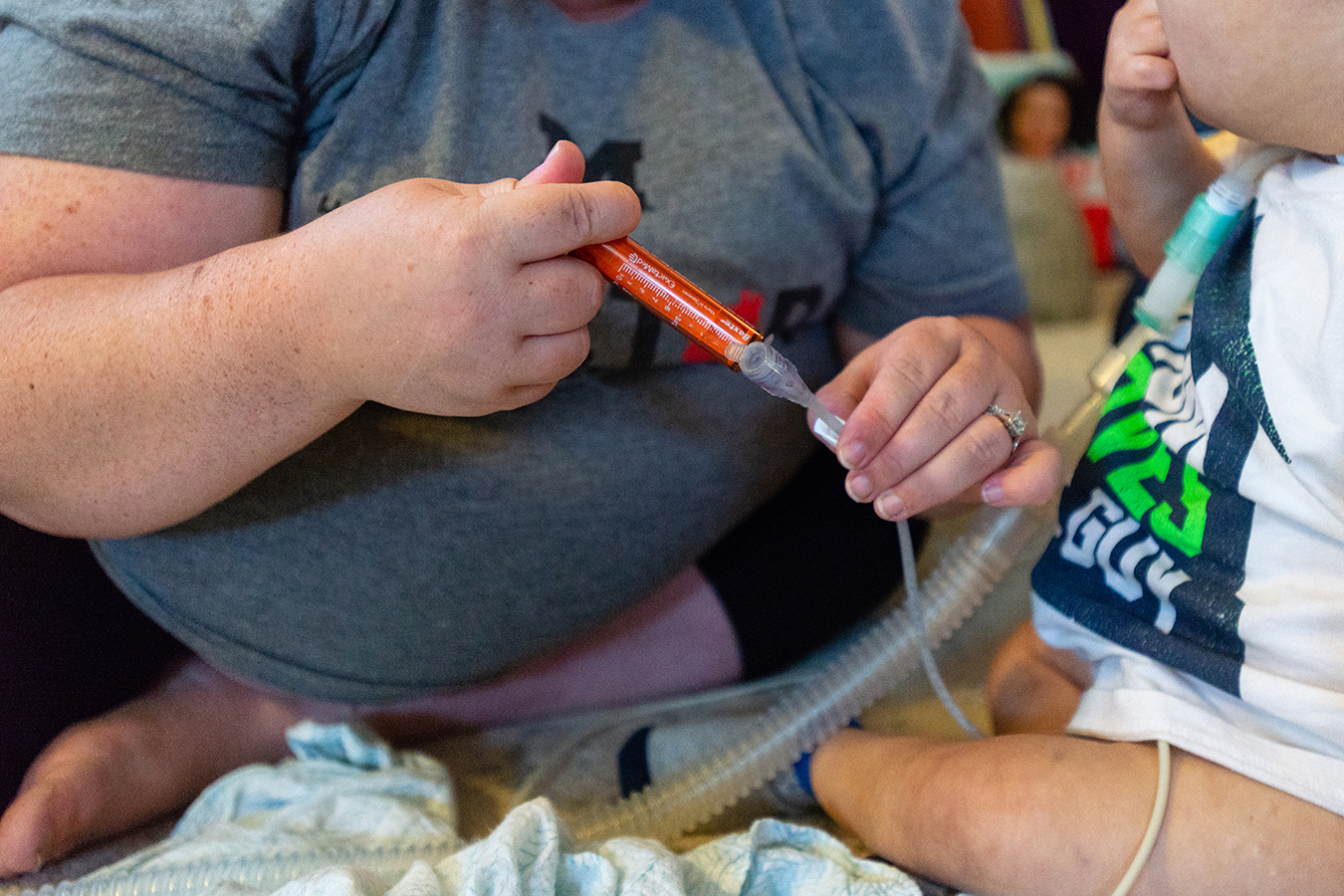 While her husband drives, Alicia pulls out a clear plastic case of syringes and watches the clock on the dashboard. Anderson needs about two dozen different medicines every 24 hours, and Alicia administers them via a port in his belly at designated times.