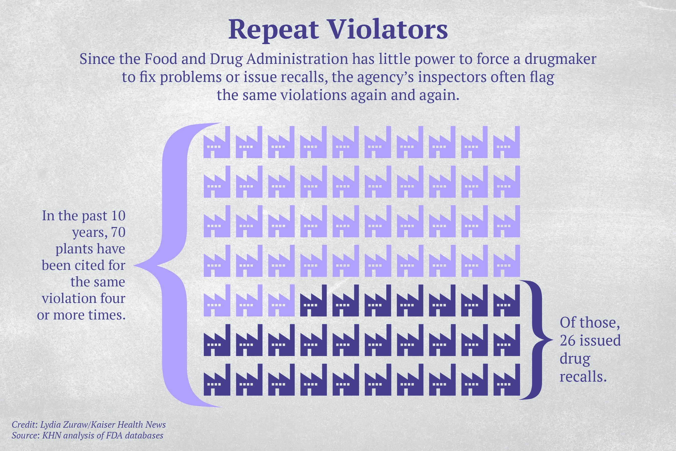 Since the FDA has little power to force a drugmaker to fix problems or issue recalls, FDA inspectors often flag the same violations again and again. A KHN analysis found that over the past decade 70 drug plants — most of them domestic — were penalized for the same violation at least four times. And more than a third of those plants has issued a recall at some point.
